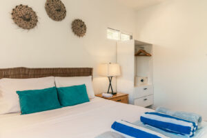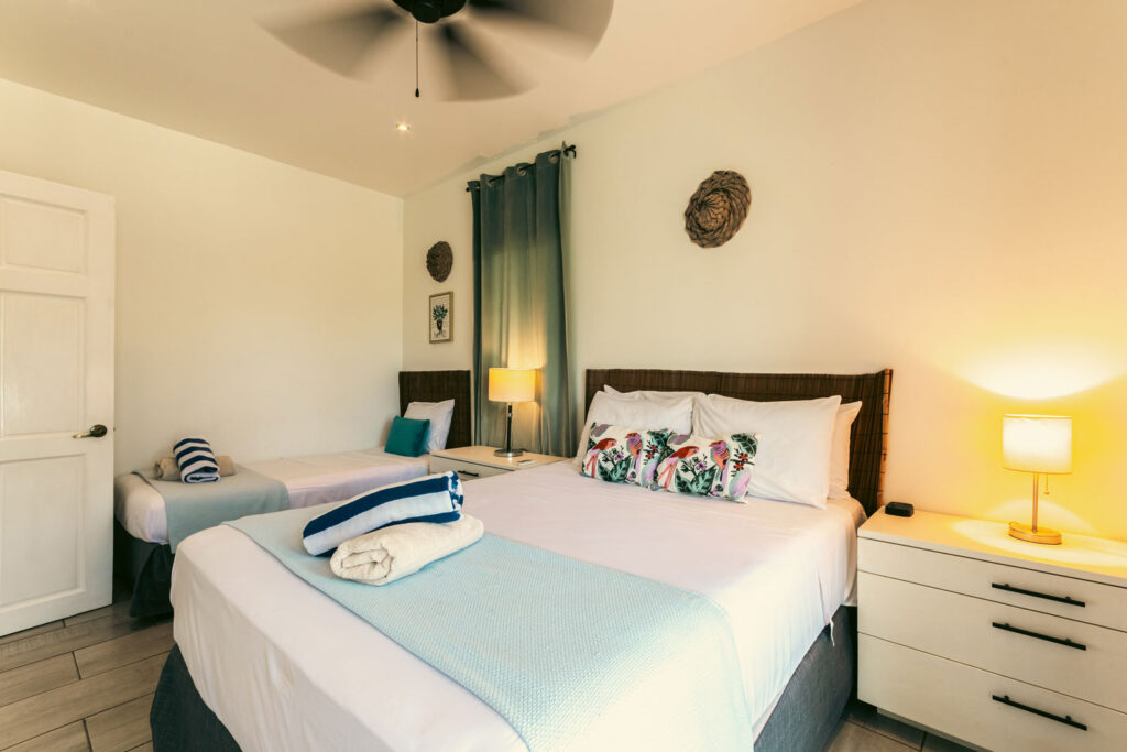 The first bedroom features a queen and twin bed, generous storage, and air conditioning for ultimate comfort. Sliding glass doors open to the west-facing balcony, where year-round sunsets paint the sky — the perfect place to unwind after a day at the beach. A full bathroom is conveniently located just outside the room. The master bedroom offers a queen pillow-top bed, en suite bathroom, and thoughtful details including an armoire, personal safe, and air conditioning. Sliding doors provide direct access to the west-facing balcony, inviting in natural light and tranquil views that make each morning feel like a fresh start in paradise.